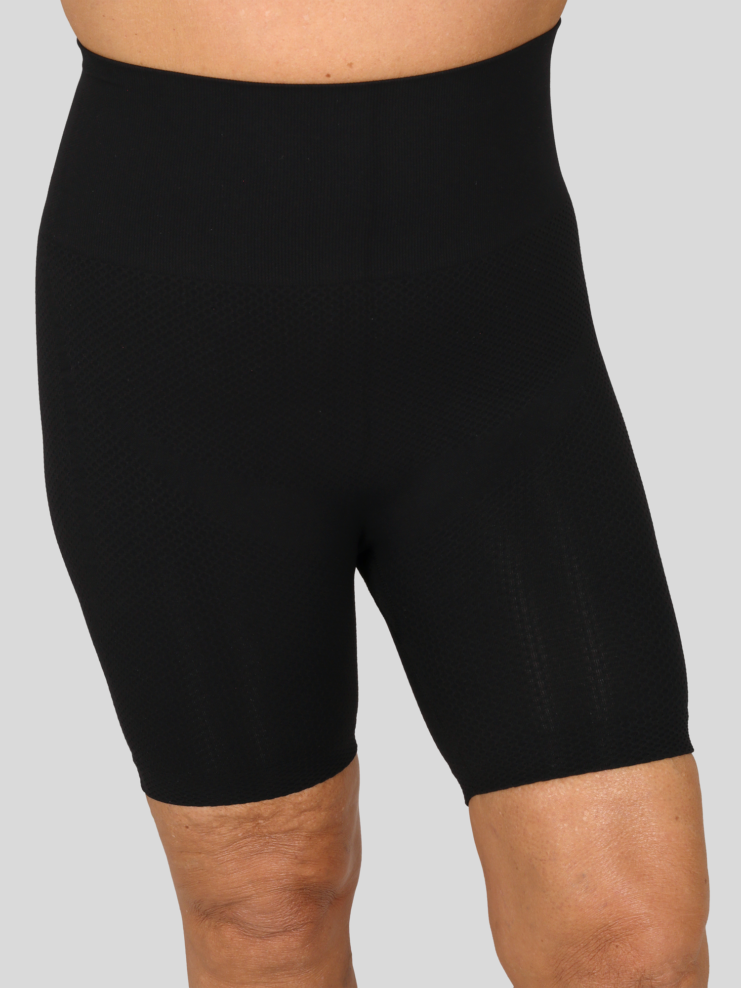 Der doppelte Shapebund liegt eng an und schmiegt sich sanft um deine Taille, sodass diese optisch schmaler und dein Bauch flacher wirken. Oberschenkel- sowie Hüft-Problemzonen werden hervorragend umverteilt und optisch in eine einheitliche Linie gebracht.