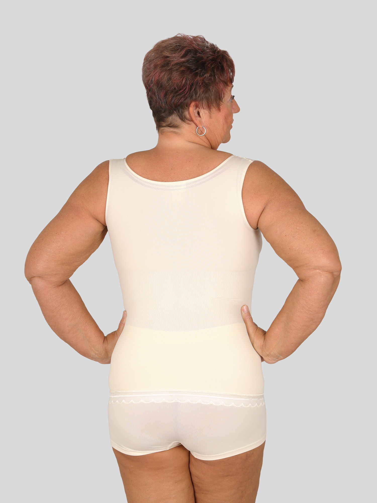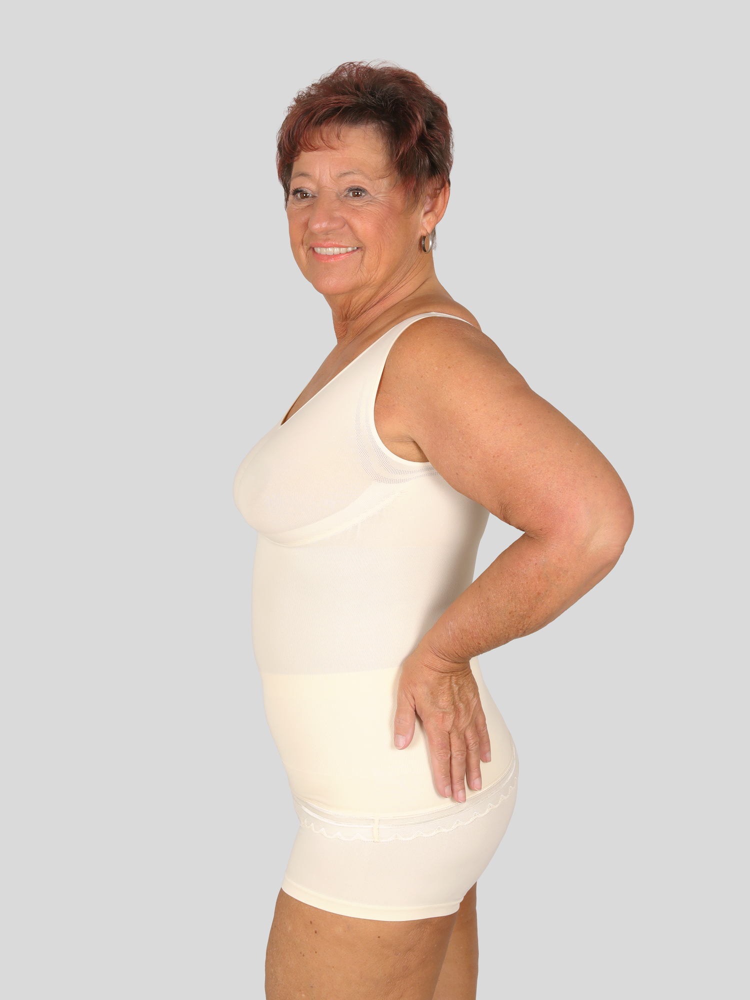 - Flacher Bauch, schmale Taille sowie optische Straffung der Figur