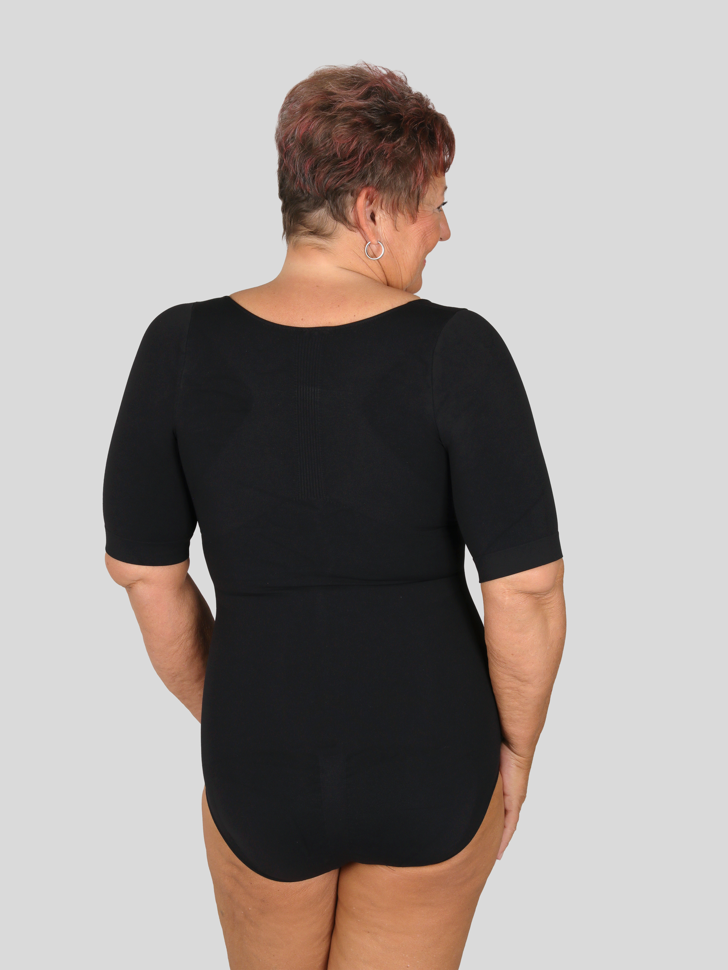 Die verstärkte Push-Up-Zone im Büstenbereich verleiht auch einer großen und schweren Brust zusätzlichen Halt und die weichen Ärmel straffen den Bereich der Oberarme sanft.