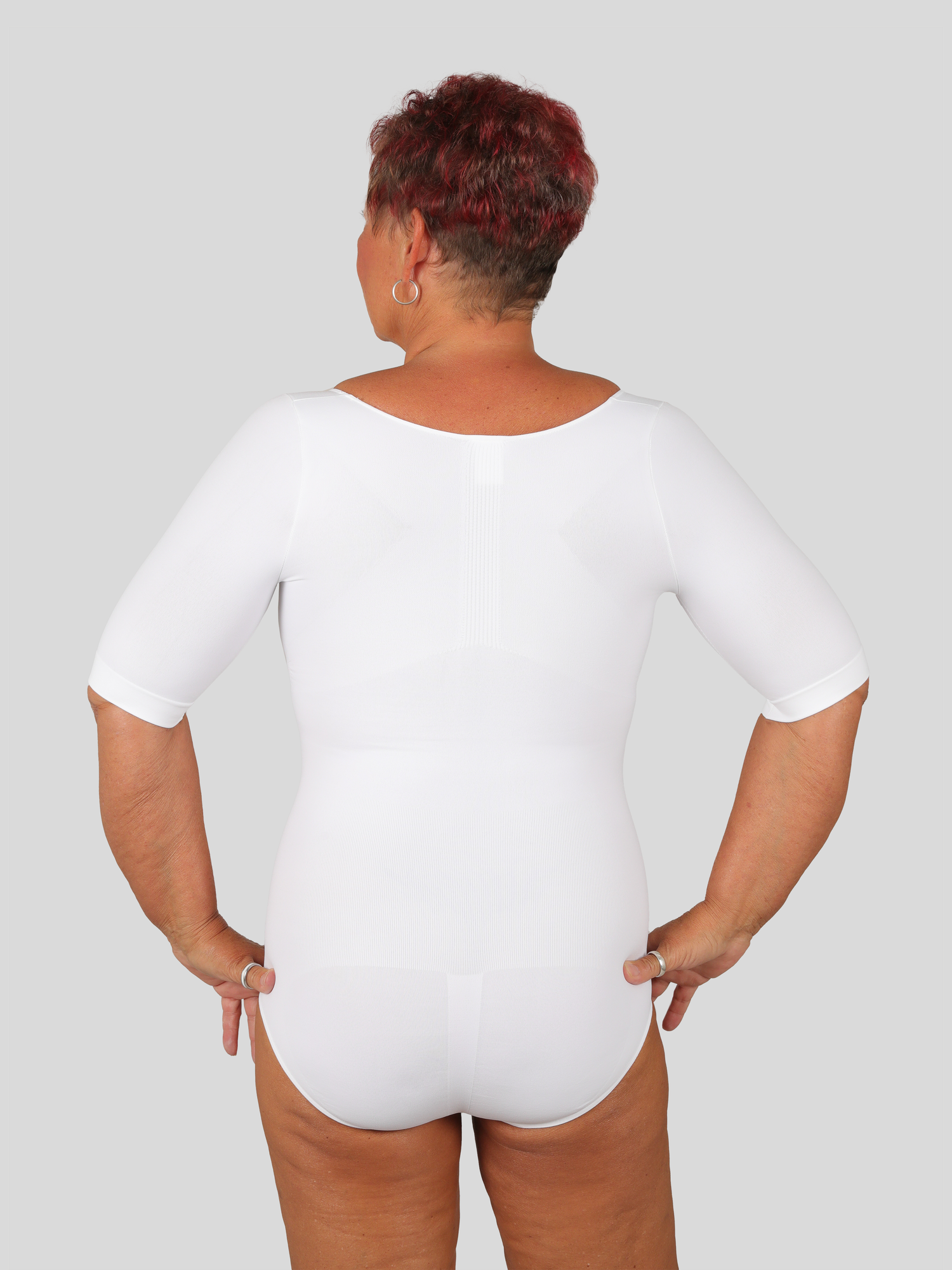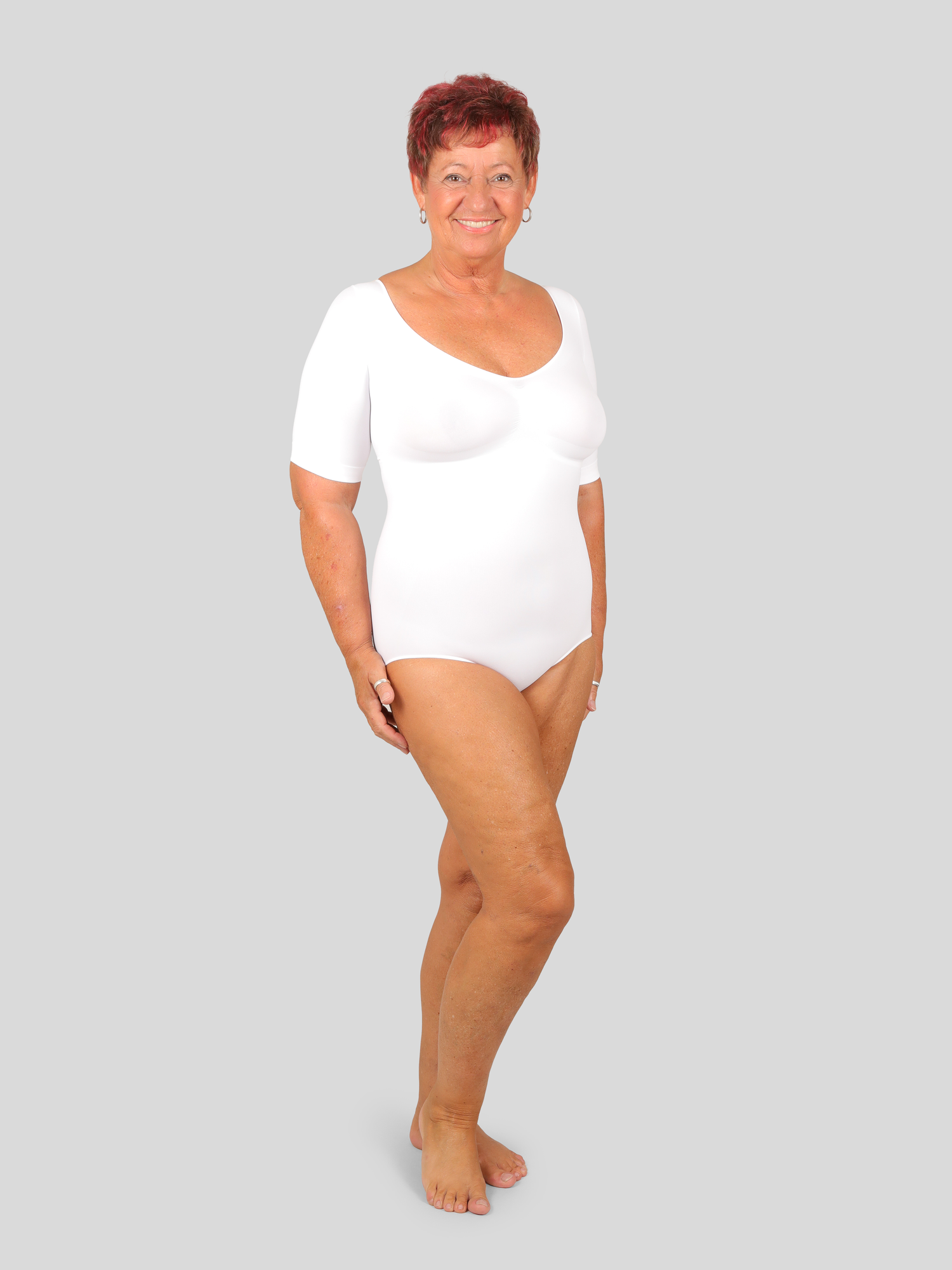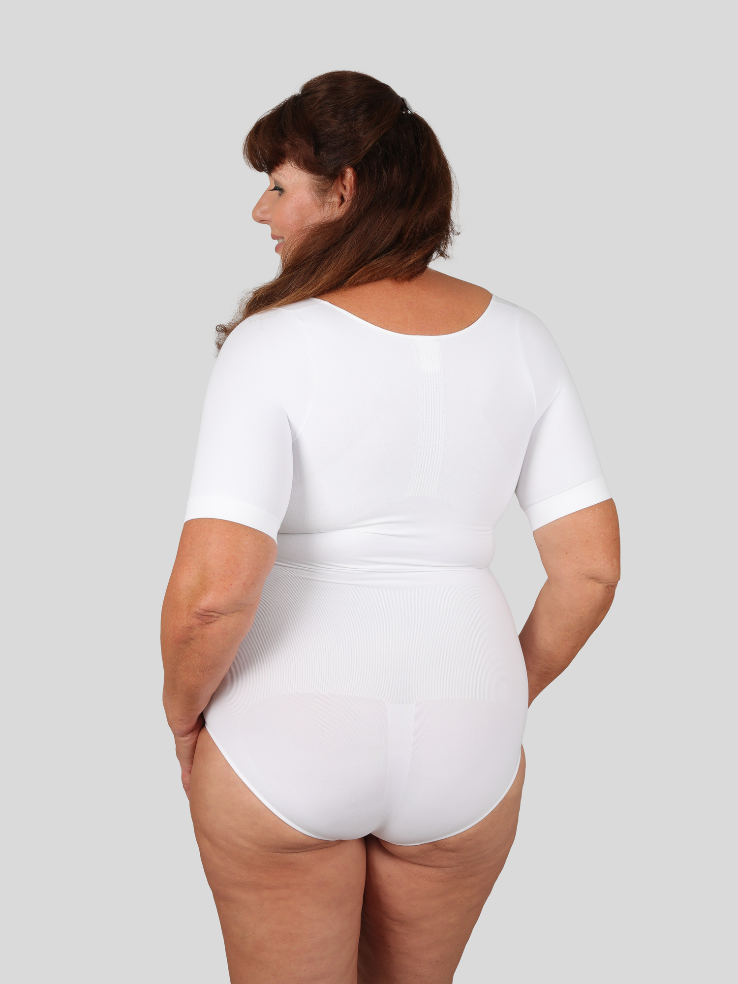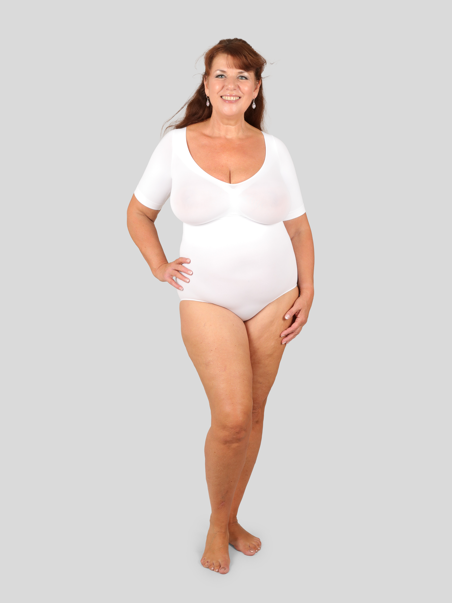 Die verstärkte Push-Up-Zone im Büstenbereich verleiht auch einer großen und schweren Brust zusätzlichen Halt und die weichen Ärmel straffen den Bereich der Oberarme sanft.