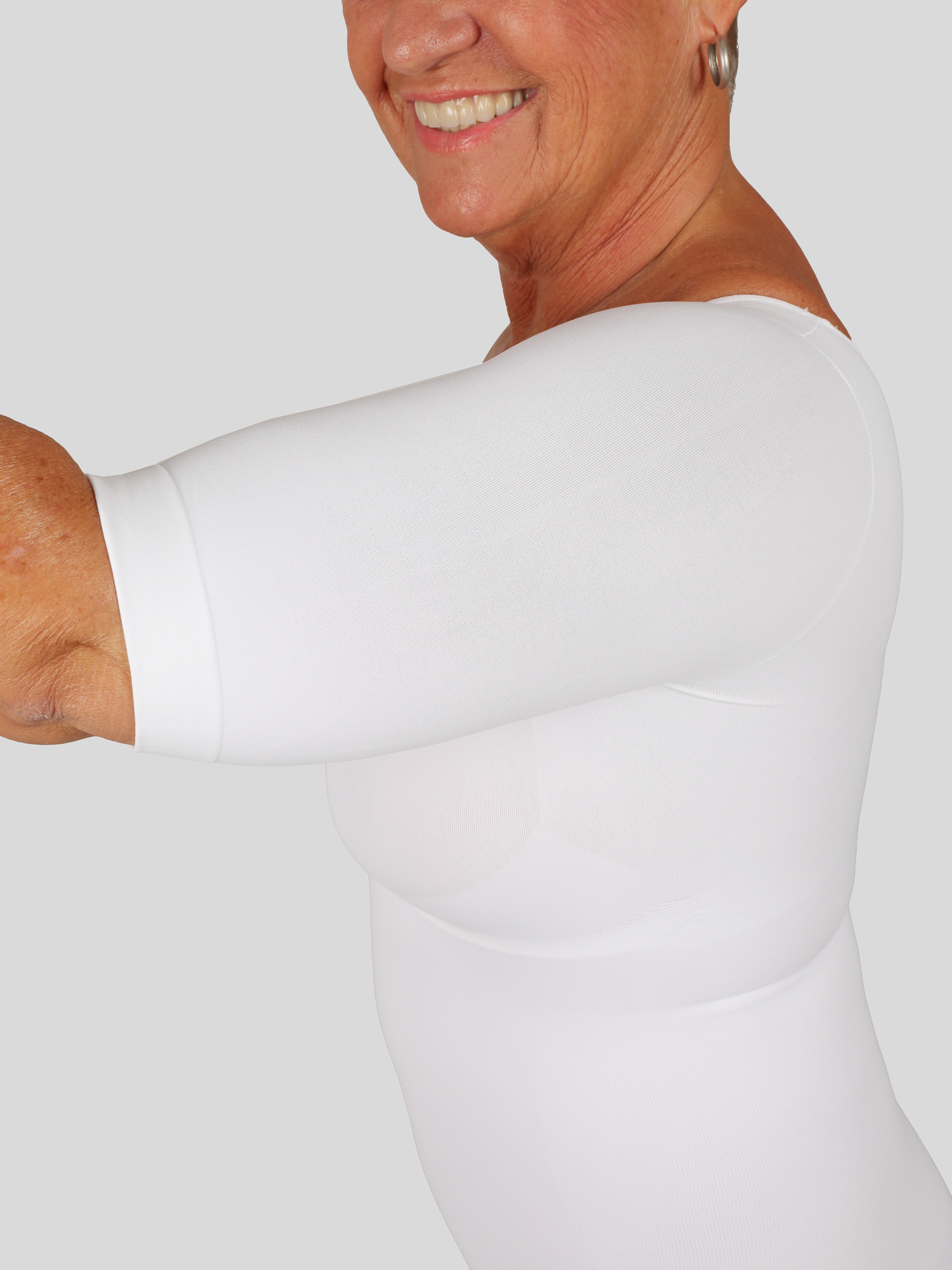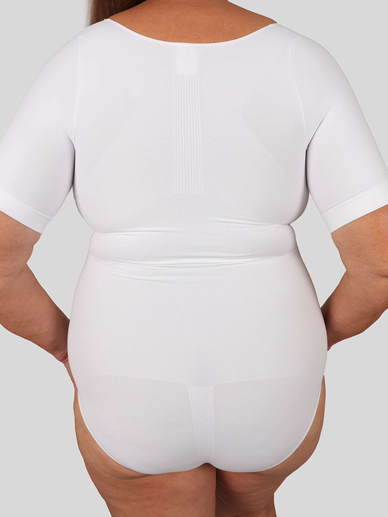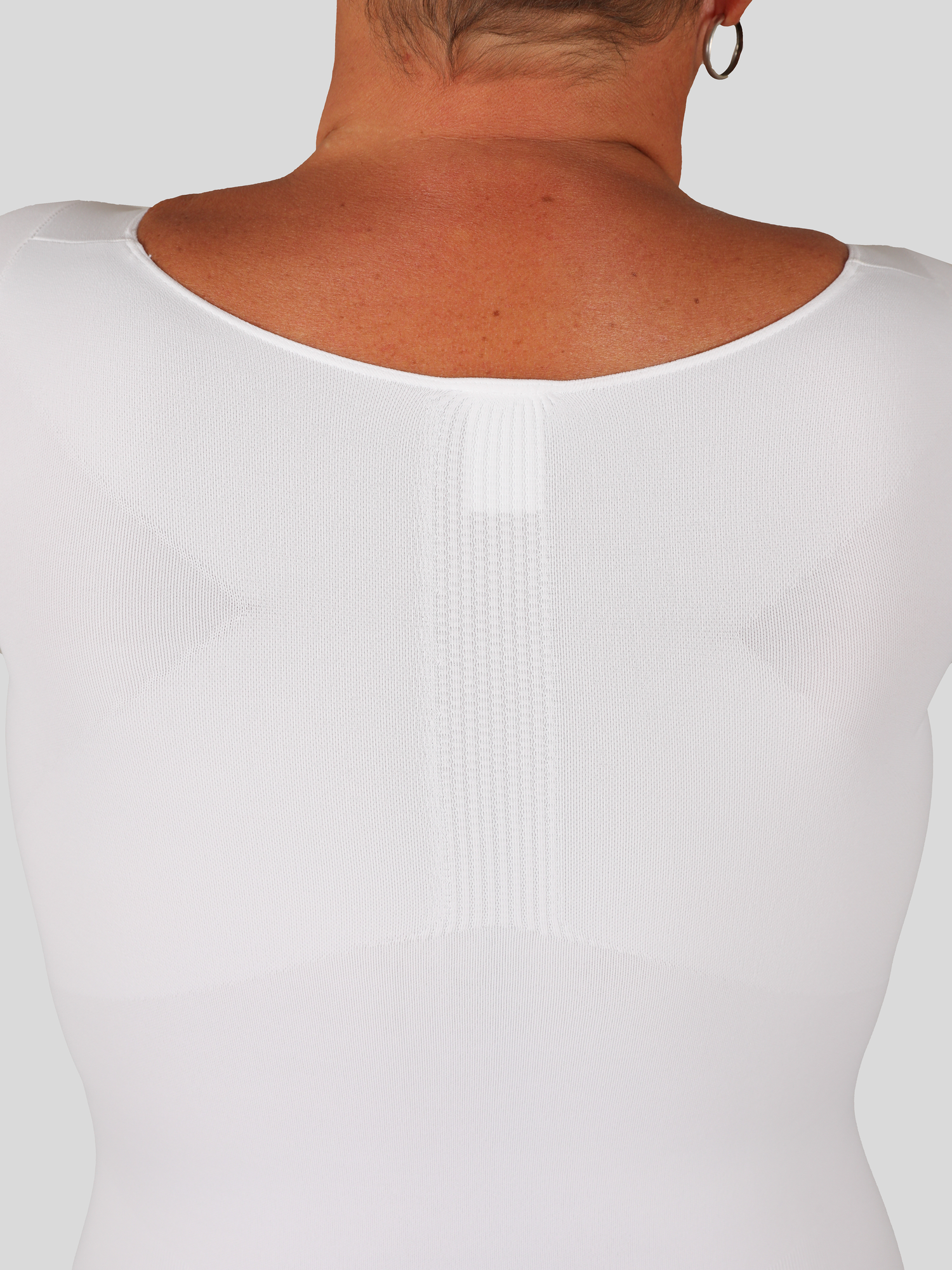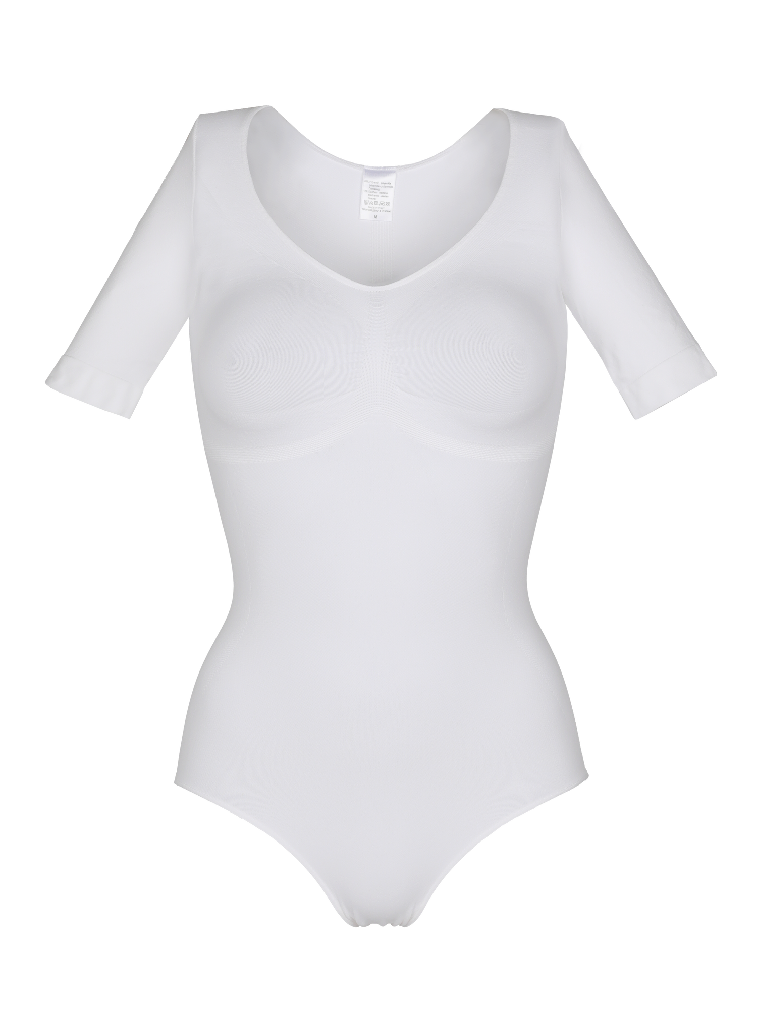 Die verstärkte Push-Up-Zone im Büstenbereich verleiht auch einer großen und schweren Brust zusätzlichen Halt und die weichen Ärmel straffen den Bereich der Oberarme sanft.
