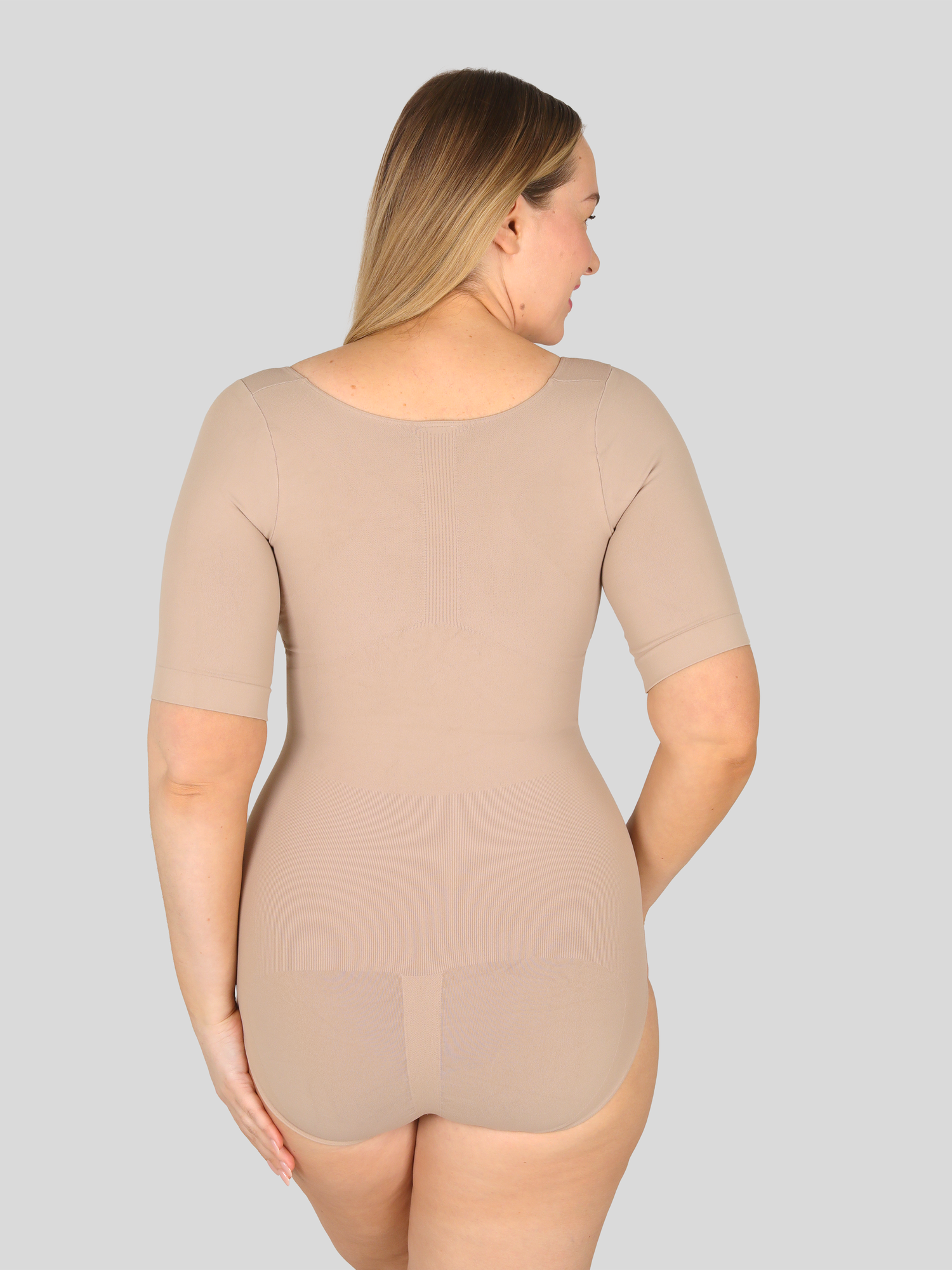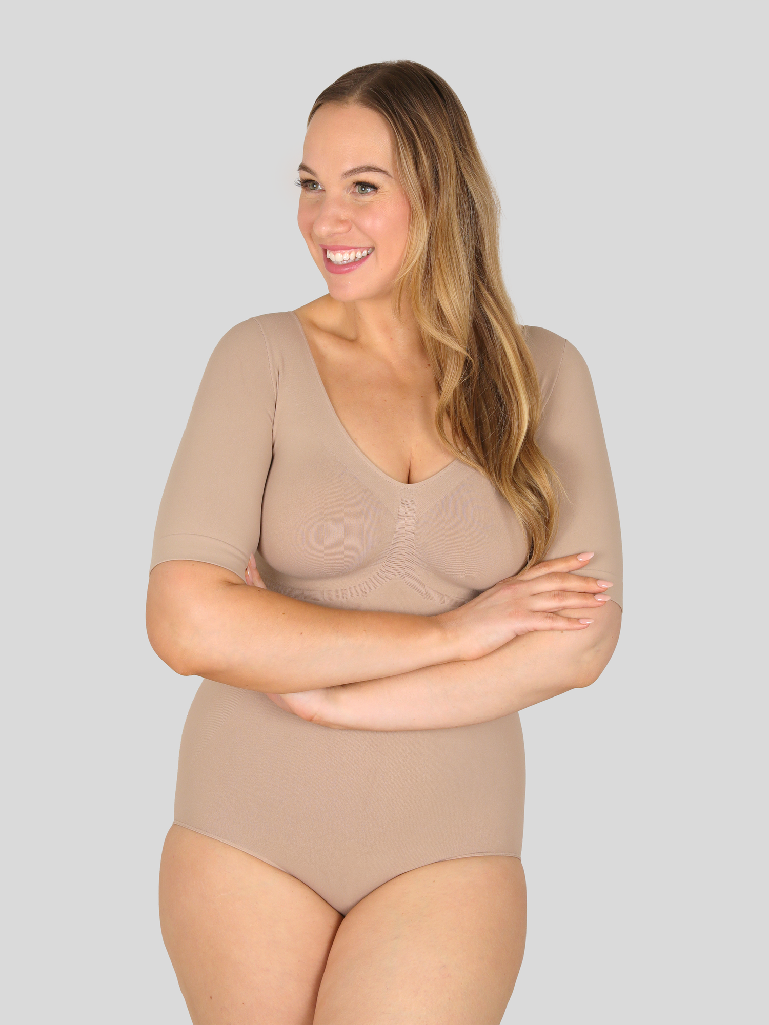 Die verstärkte Push-Up-Zone im Büstenbereich verleiht auch einer großen und schweren Brust zusätzlichen Halt und die weichen Ärmel straffen den Bereich der Oberarme sanft.