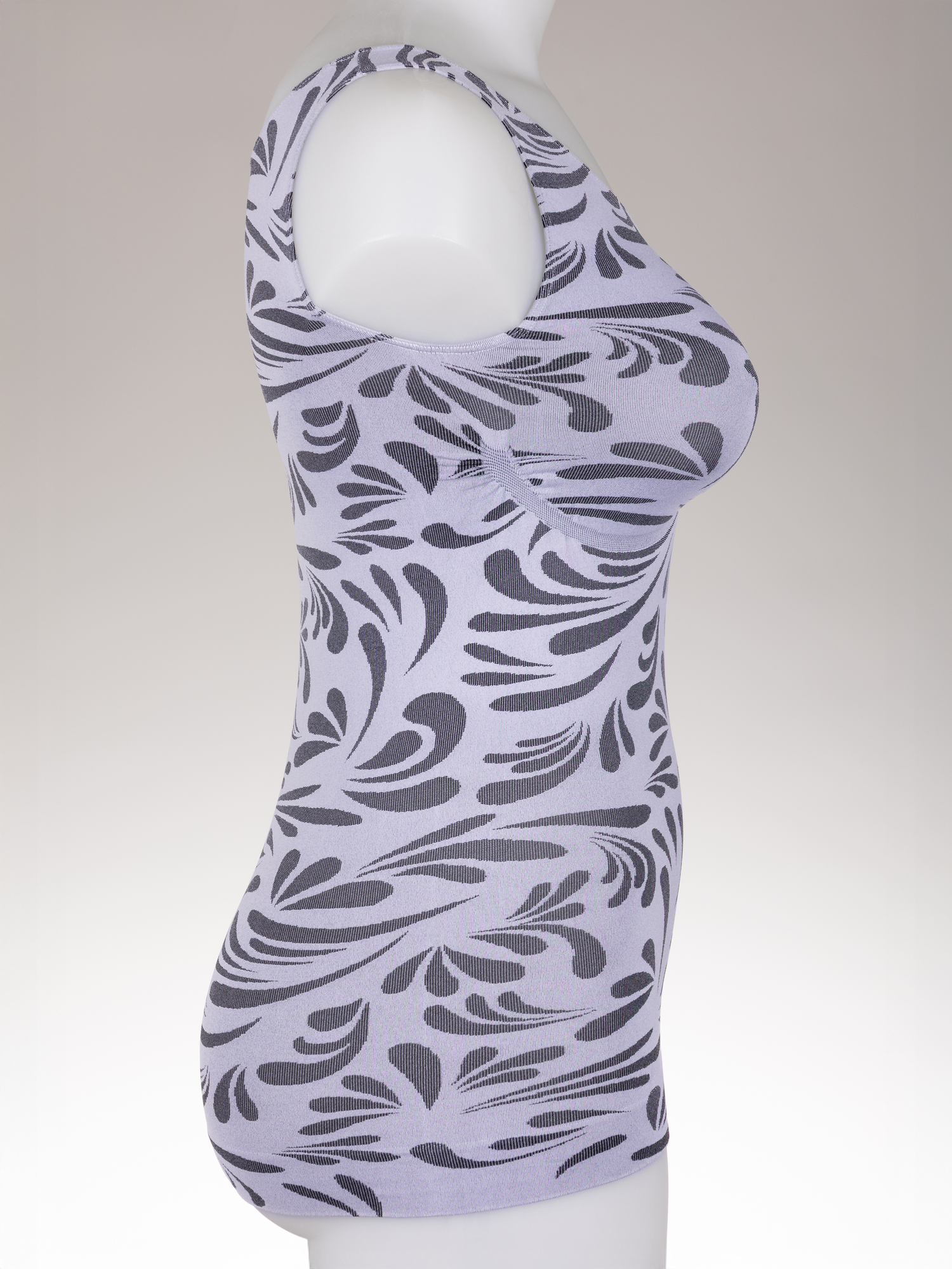 Das figurformende Top aus besonders weichem, glatten Garn mit Push-Up-Zone, R-Ausschnitt und einer modischen Raffung lässt sich sehr angenehm tragen und schmeichelt deiner Figur. Zudem sorgt das schwarze, schwungvolle Allover Schnörkel-Design für einen besonderen Blickfang und formt optisch deine Taille.